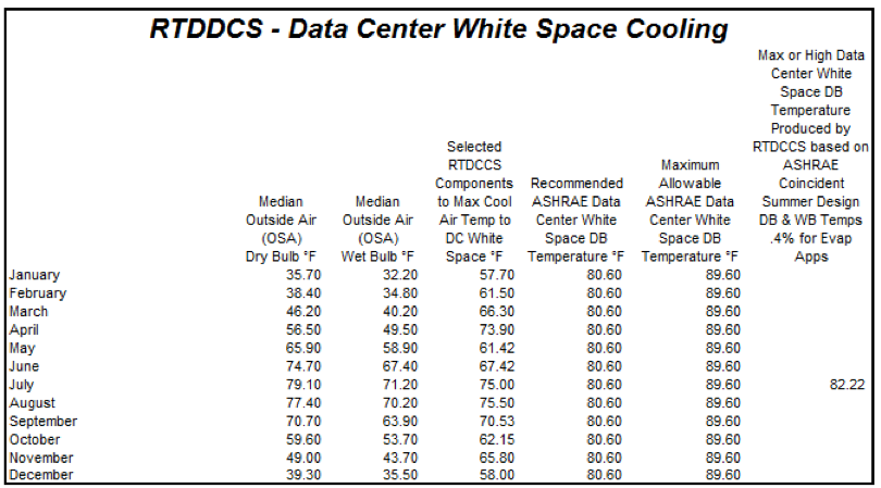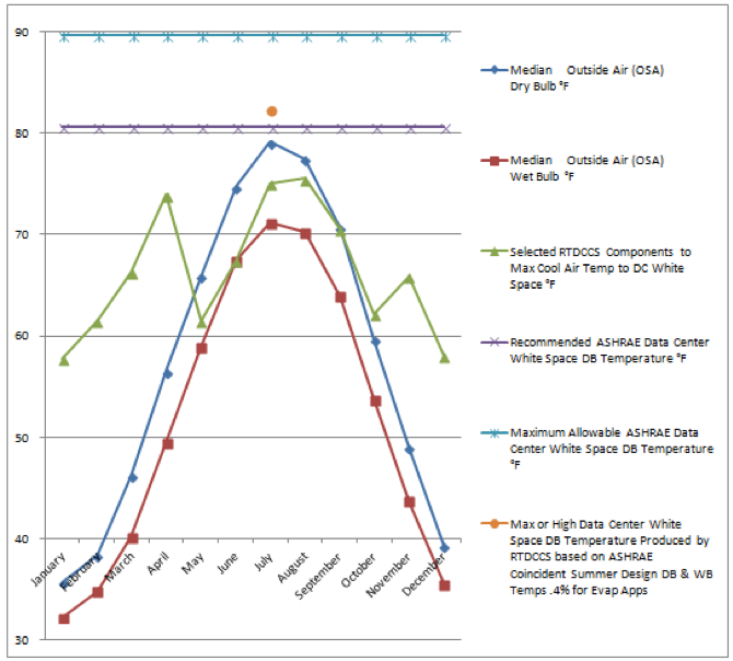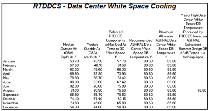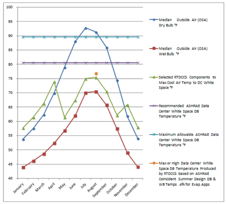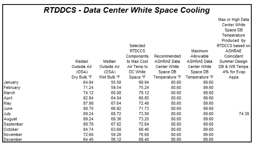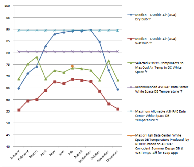 - Based on the Monthly Mean Dry Bulb and Wet Bulb Temperatures – Data Center White Space temperature (for the entire compute space) can be maintained at a set point temperature of 76.20 °F (24.56 °C) in the hottest month of July completely eliminating hot aisles and cold aisles. No compressors and refrigerants are used in the system. Significant additional energy can be saved by maintaining an ASHRAE TC 9.9 (Class A1 components on Page 11) recommended set point temperature of 80.6 °F (27 °C) in the Data Center White Space.
