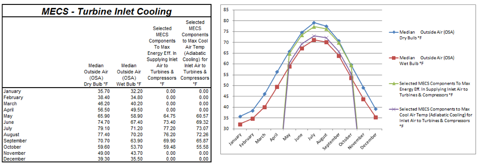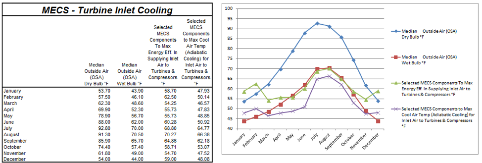 - Based on the Monthly Mean Dry Bulb and Wet Bulb Temperatures – For Inlet Air Cooling for Nat Gas Turbines/CHP Systems and Compressed Air Systems, cold supply air temperatures provided to inlet of the combustion turbine can be maintained at an air temperature of 70.10 °F in the hottest month of August. No compressors and refrigerants are used in the system. Significantly lower cold air supply temperatures of between 55.10 °F and 65.10 °F can be maintained by adding dehumidification to the MU AHU.