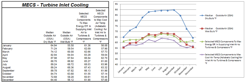 - Based on the Monthly Mean Dry Bulb and Wet Bulb Temperatures – For Inlet Air Cooling for Nat Gas Turbines/CHP Systems and Compressed Air Systems, cold supply air temperatures provided to inlet of the combustion turbine can be maintained at an air temperature of 77.40 °F in the hottest month of August. No compressors and refrigerants are used in the system. Significantly lower cold air supply temperatures of between 62.40 °F and 72.40 °F can be maintained by adding dehumidification to the MU AHU.